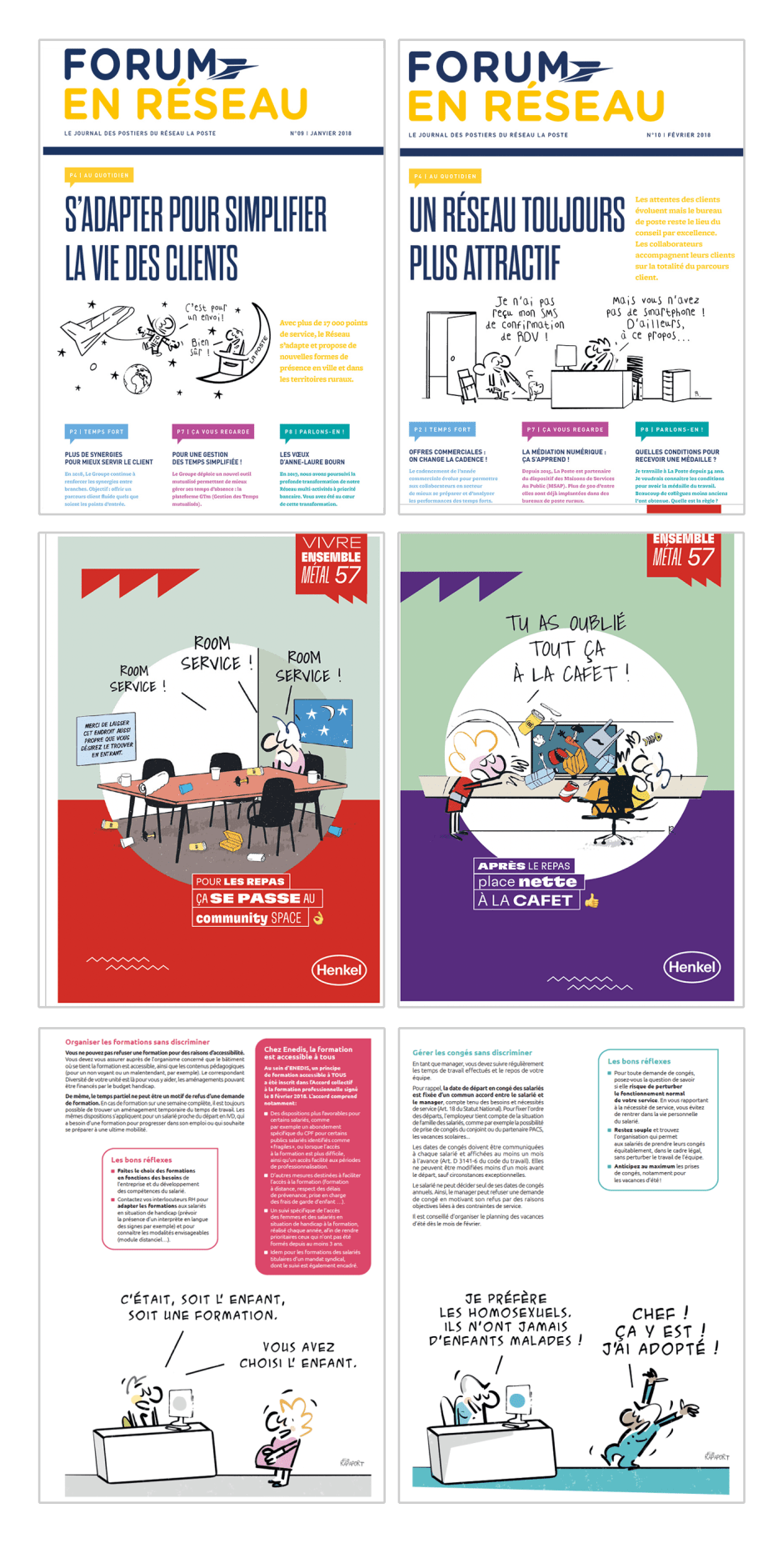 Je travaille essentiellement en communication interne. Sur tous les supports de communication interne: Journaux, intranet, newsletter, affiches, guides, livres, etc. J’anime avec du dessin en direct des conventions, des séminaires, des ateliers et des conférences.